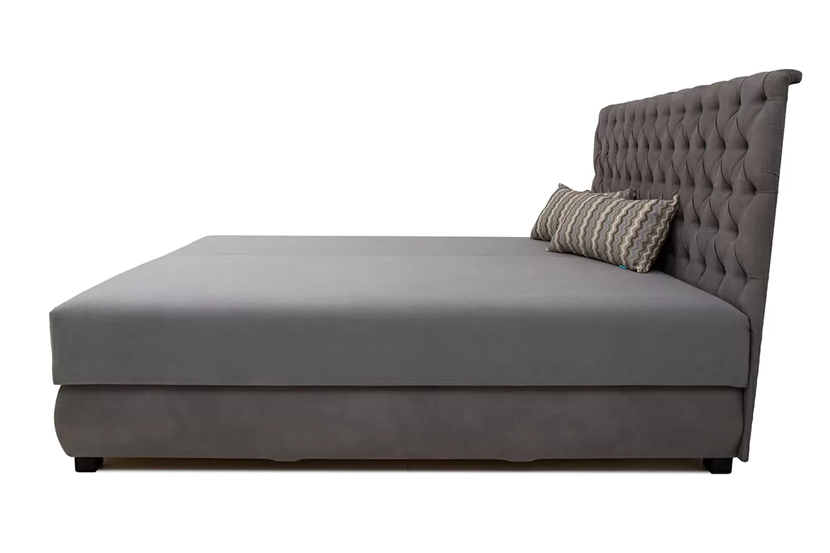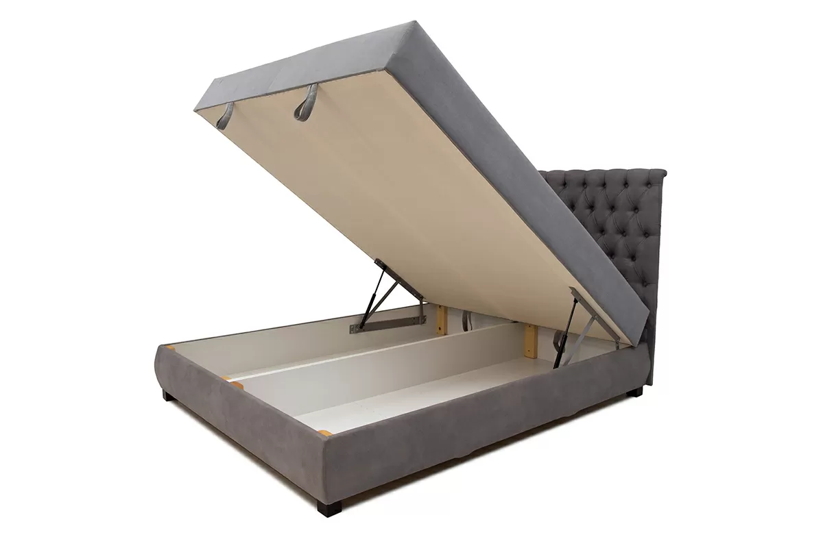 Кровать оснащена подъемным механизмом, в ней предусмотрен вместительный ящик для хранения белья и постельных принадлежностей. В комплект входят 2 декоративные подушки.