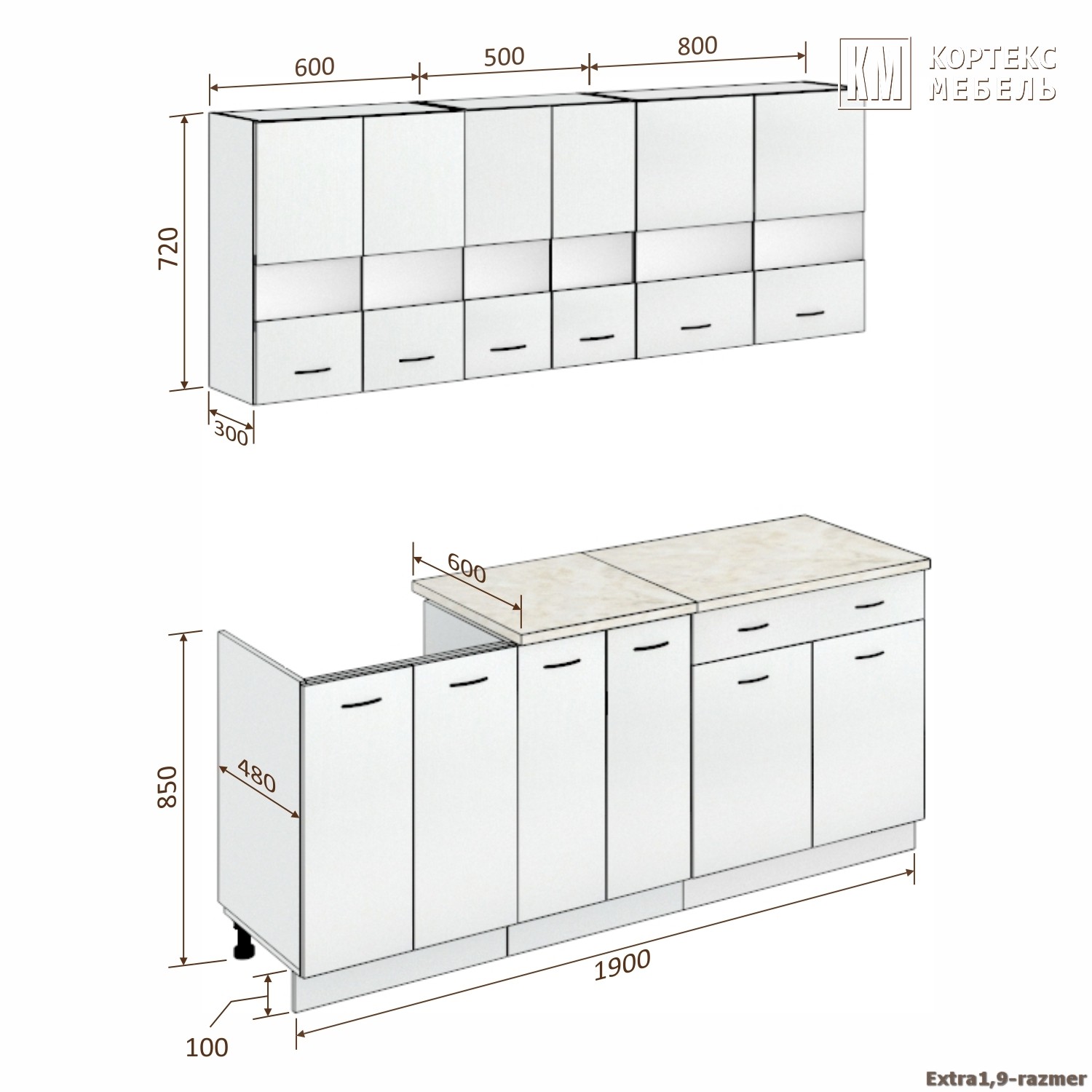 Глубина нижних шкафов, мм 480