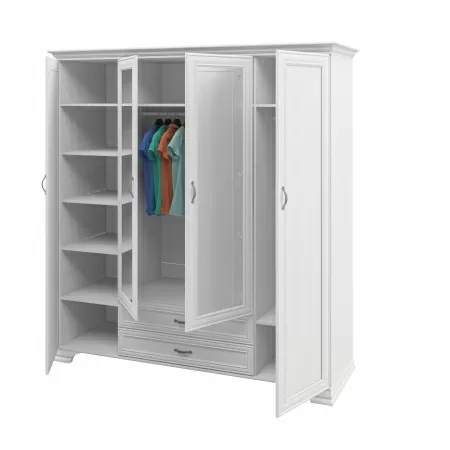Шкаф Юнона МН-132-04 от фабрики Мебель-Неман - это четырехстворчатый шкаф с зеркалом для одежды в классическом стиле с отделкой структурной фактуры, обрамленный рамочным фасадом, где металлические ручки выгодно подчёркивают стиль и изящество, всегда актуальна и востребована. Шкаф имеет два выдвижных ящиках внизу.Особенности трехстворчатого шкафа Юнона МН-132-04: