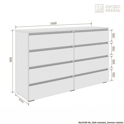 Комод Кортекс Мебель БАРИ 160-8ш (Белый/Белый/Дуб Сонома)