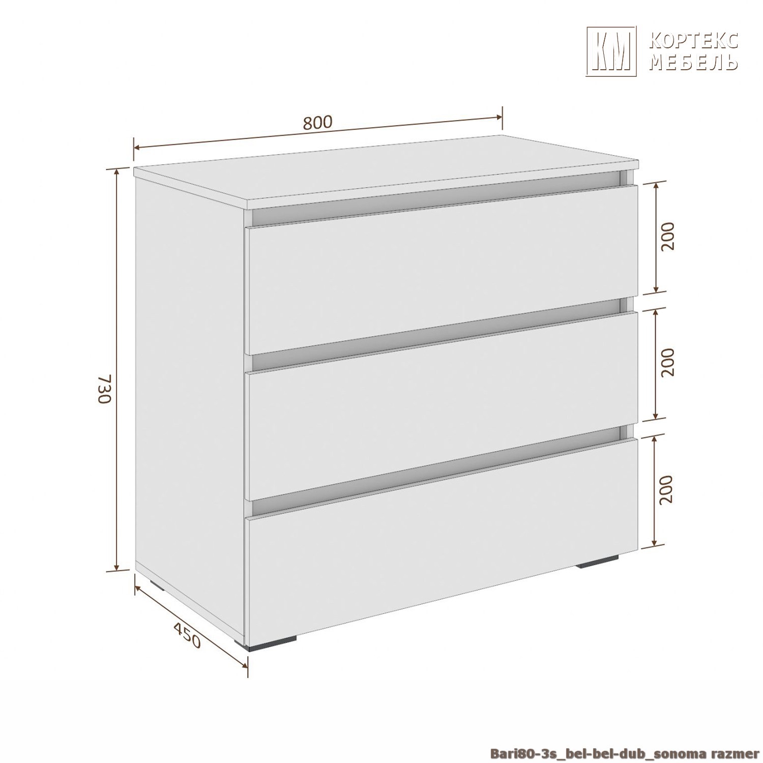 Комод Кортекс Мебель БАРИ 80-3ш (Дуб Сонома/Дуб Сонома/Белый)